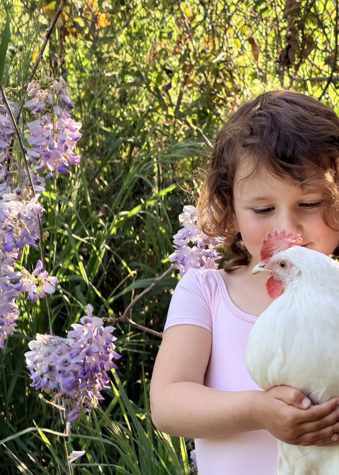 « … Imagine me and you, I doI think about you day and night, it’s only rightTo think about the chicken you love and hold her tight. So happy together… » the Turtles Wisteria, pink tutu – holding sparkle.