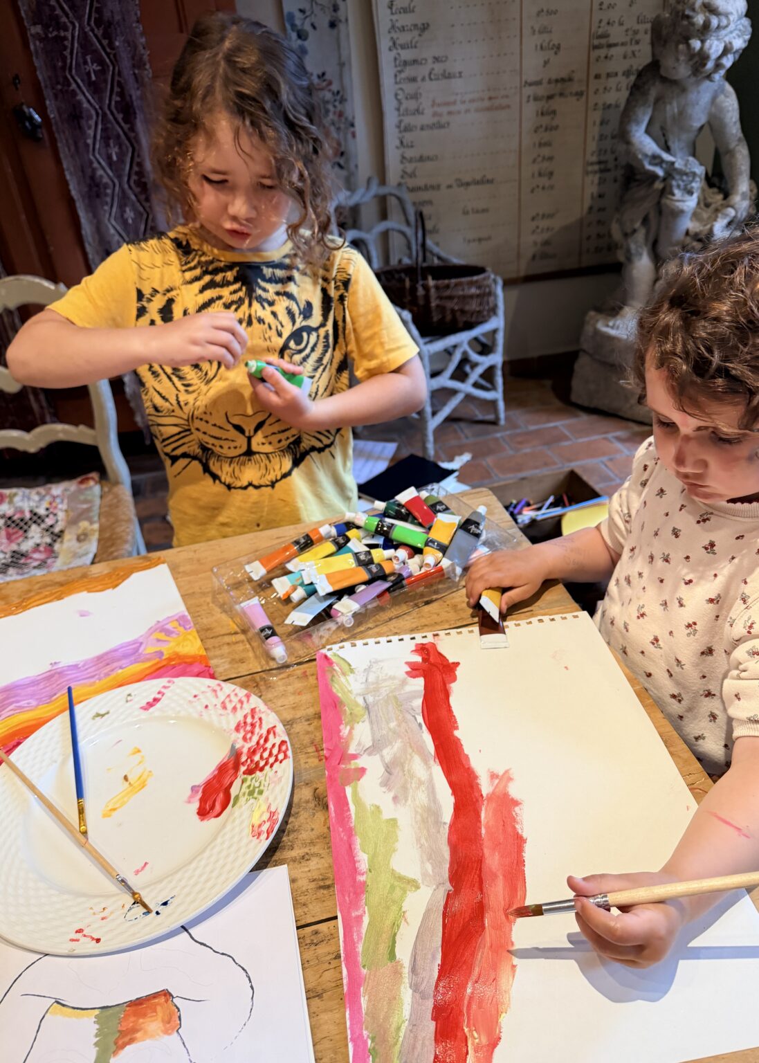 and while they painted we talked about types of paint, painters such as Matisse, what we would have for lunch (pasta with sardines,) and how the word « bro » is not a name but an abréviation of brother- therefore not really a name for a baby…