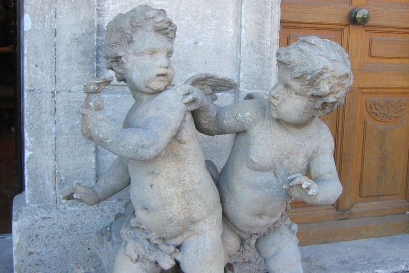 Early in the morning, after I had set up my wares to sell at the brocante market, I quickly took a tour to see what might be interesting to buy. Not faraway from my stand, in fact on the other side of the fountain, I saw a painting rolled out like a hallway rug. The painting was long and narrow depicting an 18th century child dressed in blue silk. In the painting the child was dancing before the court with his colorful tambourine.