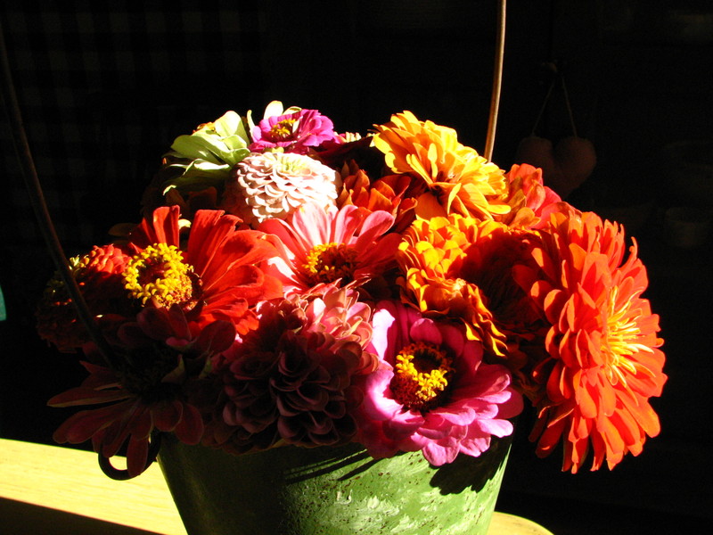 Wonderful picture of your green bucket and bright beautiful zinnas.