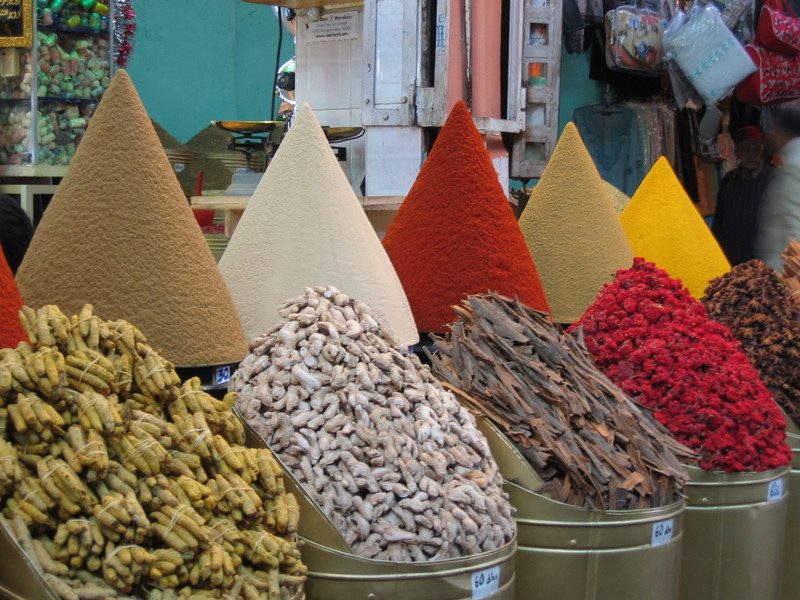 High mountains of spices burst flavor like exotic kisses.