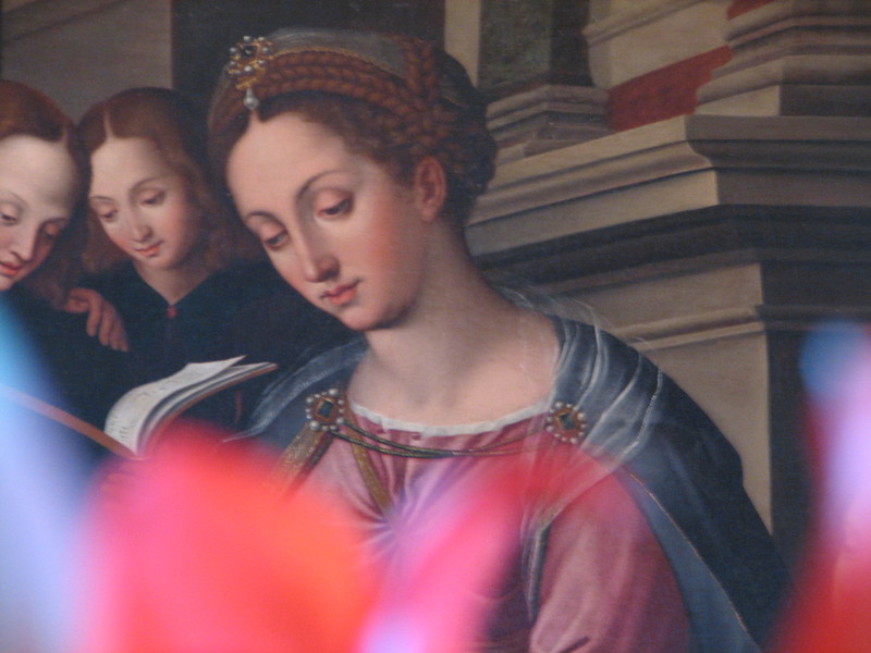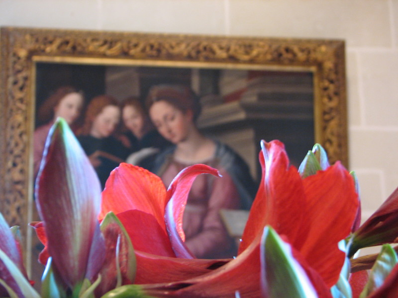 photo: Interior images of Chateau de Chenonceau. Flowers bloom red in front a painting of a woman wearing a pearl pin in her hair.
