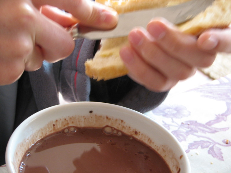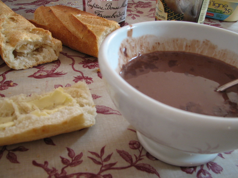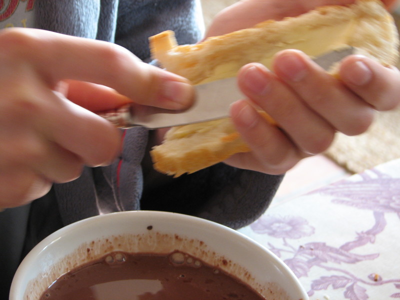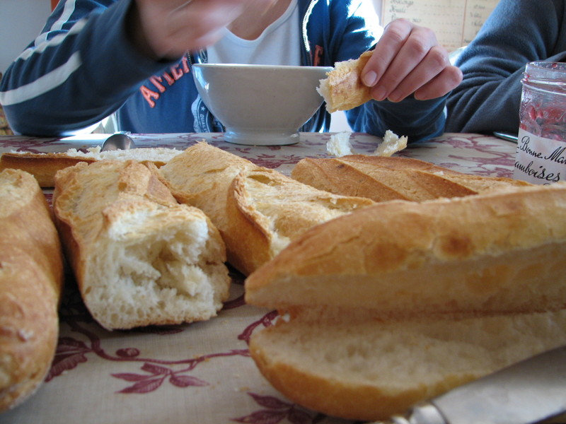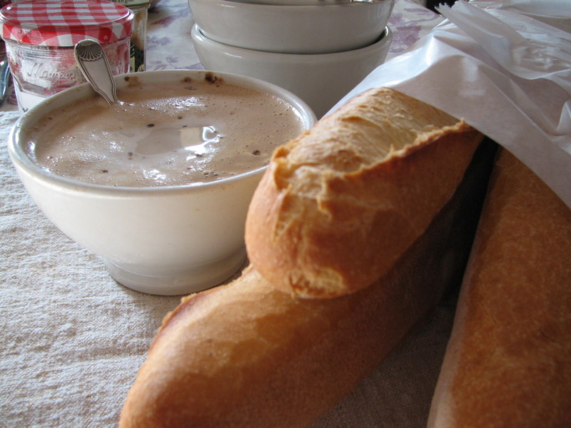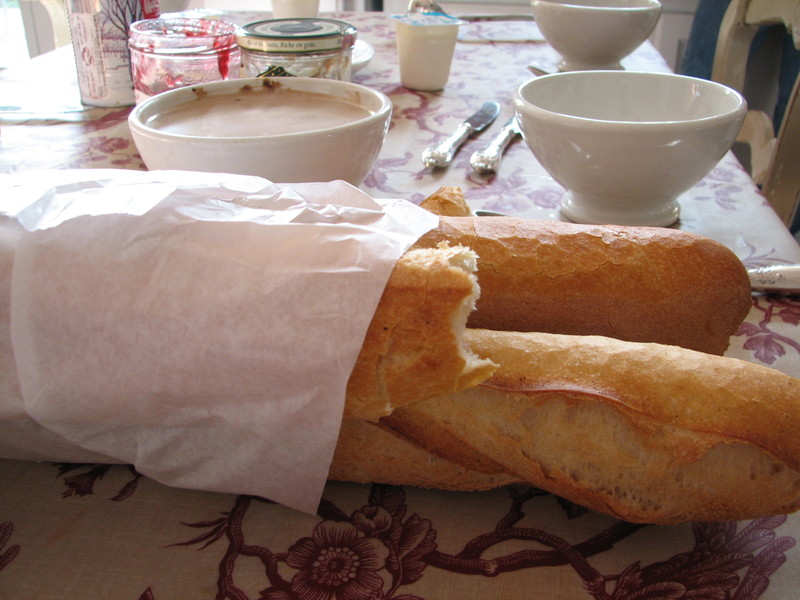 The church bells ring in the morning, the good bakery (there are several in our village, we call it the "good bakery," as not to be confused with the others.) has a line a mile long! Sacha stands waiting his turn to buy our baguettes. We anxiously await to Break-the-fast! The cafe au lait bowls are steaming hot with cafe or chocolat chaud! The end of the baguette, Sacha will tear off and eat on the walk home.