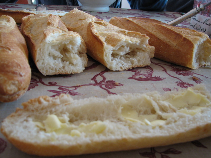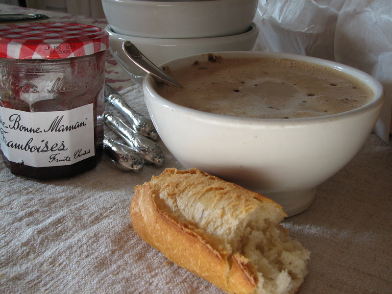 The baguettes are cut in long strips called, tartines. The mie (the soft tender part of the bread,) awaits to be robed with confiture de framboise ou creme de marron ( Raspberry jam or chestnut cream!) My mouth waters, the sun shines, and the morning chatter begins with the sound of the breaking of the bread!