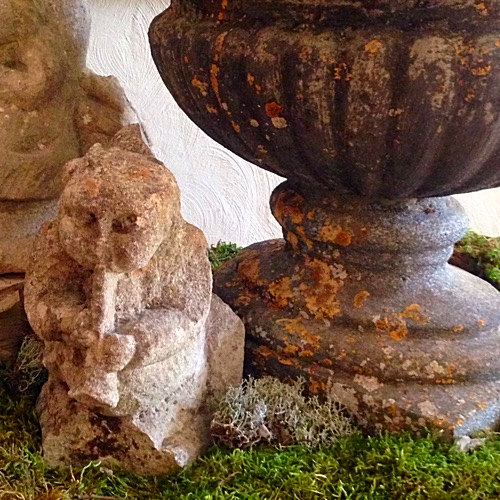 Stone carved gargoyles and an urn.
