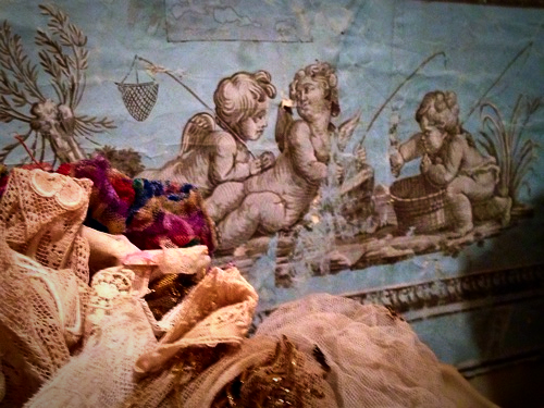 In each of the boxes there is either lace or trims, buttons or fabric, notions for hats or costumes or tassels or thread or something in regards to creating.
