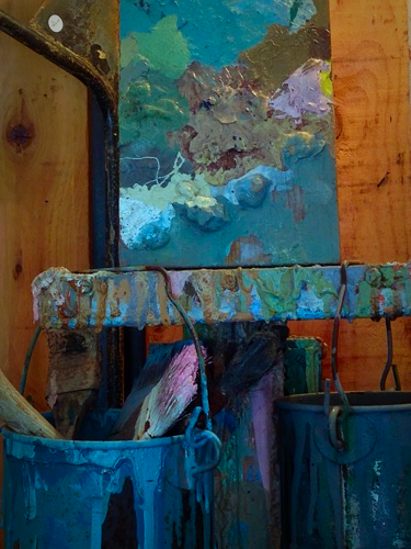 An easel with paint buckets full of used paint brushes and a painting.