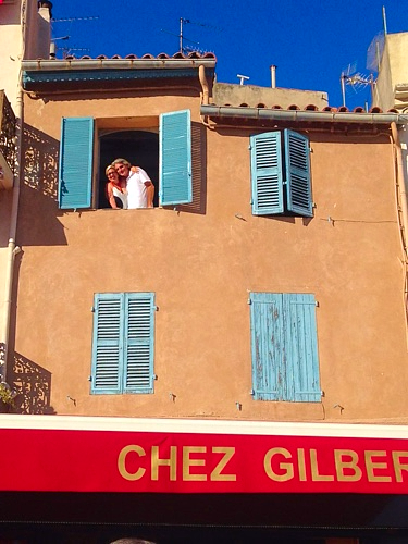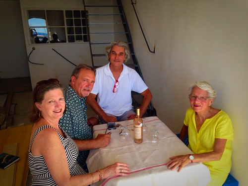 We carried a portable picnic table, where four places to sit pop out, upstairs to our apartment in Cassis. With it we brought wine, glasses, a tablecloth, yet forgot the corkscrew. Luckily the apartment is above Chez Gilbert (a restaurant) they lent us one. Since there was five of us French Husband sat on the paint bucket.