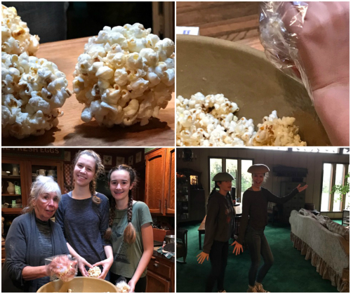 This morning my mom woke up with the chickens and made waffles, cream puffs, popcorn balls… enough to make me wonder if the scale will tip when I get on it. Sacha gained 12 pounds when he came home last! He seemingly lost it over night once he was in France. The girls are making thumb print cookies. Does the baking ever end around here? No.