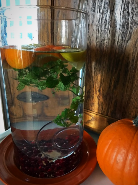 My mother took a cylinder glass vase then added pomegranate seeds, mint, oranges and lemons then she put in a large glass ladle for water. My mom never misses an opportunity to make the things beautiful.