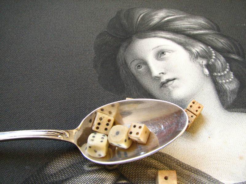 An old, large engraving of a woman with a pearl earring. A spoonful of miniature vintage Mercier champagne dice. An antique dealer told me that years ago when a person bought a glass of Mercier champagne at a bar, it was served with two dice. Whether that is true or not I do not know.