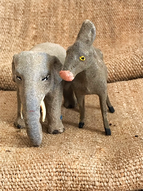 An elephant and a donkey (1900s) that I found at the brocante, part of the French "creche" = a nativity set.