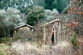 My daily walk…  old bridges,  abandoned shepherd shelters, and lovely flora: Umbrella pines, grey-green olives, rosemary just breaking into blue-bloom flowerets, wild thyme, and now the pushing pink-white buds of viburnum, oh yes, the vineyards getting ready for bud-break by month's end. Violets are poking up along the roadside rivulets matching the backdrop of azure sky.