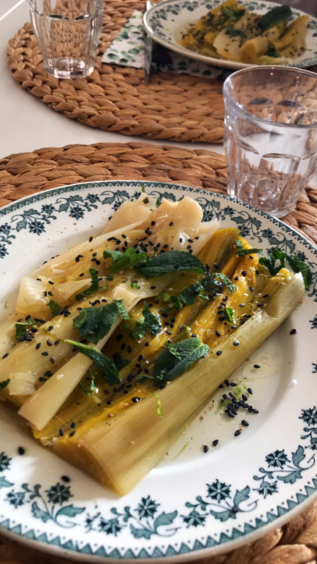 Leeks with lemon, black sesame seeds and sesame oil.