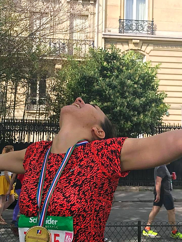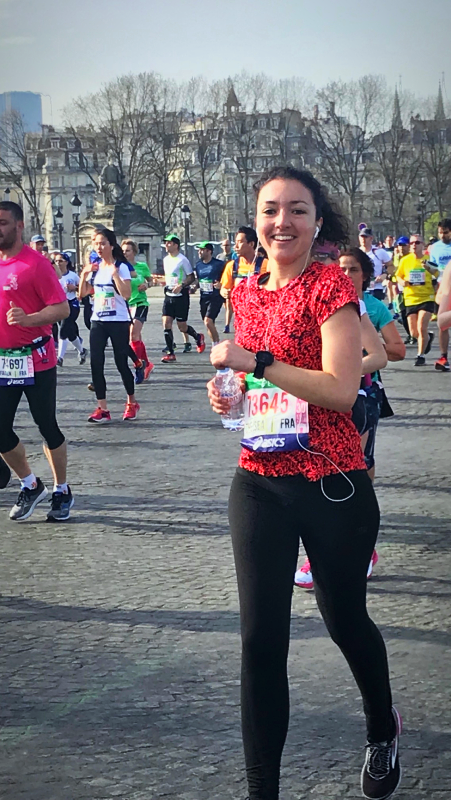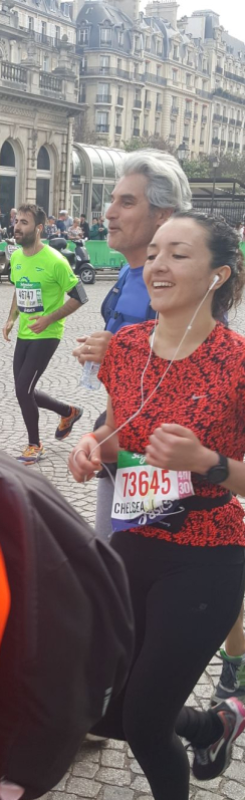 Chelsea trained faithfully for a few months in the rain and snow… mostly cold weather in Paris, yet the day of the Marathon the first spring day decided to appear at 75 Fahrenheit! A rather lovely shock from the cold winter in which she endured training.