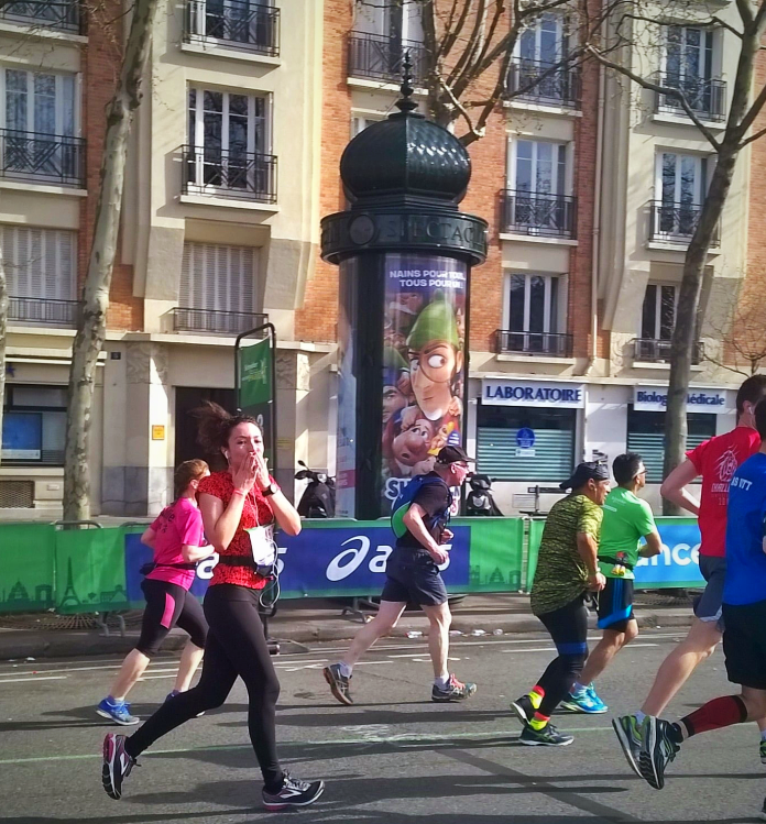 I was stationed at the Place de la Concorde at the beginning of the race. There were so many runners I doubted whether I would be able to spot her, though she spotted me and waved. My next station was at the WALL at 30 Kilometers