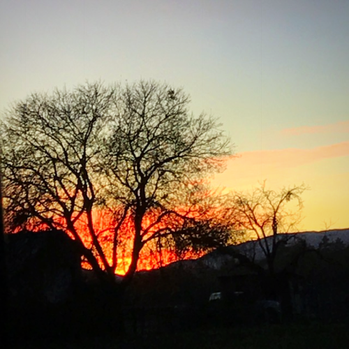 The sun sets highlighting the walnut tree by the chicken pen.