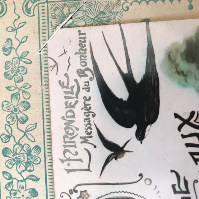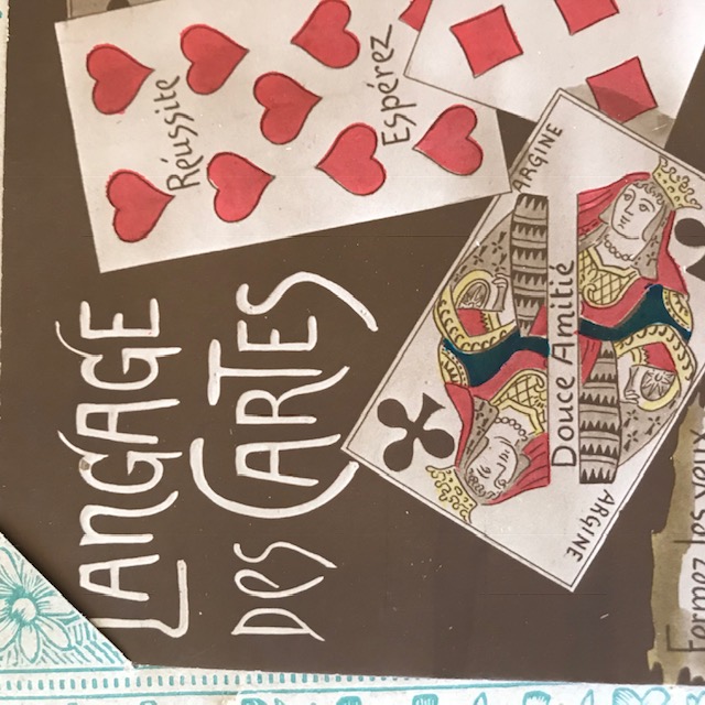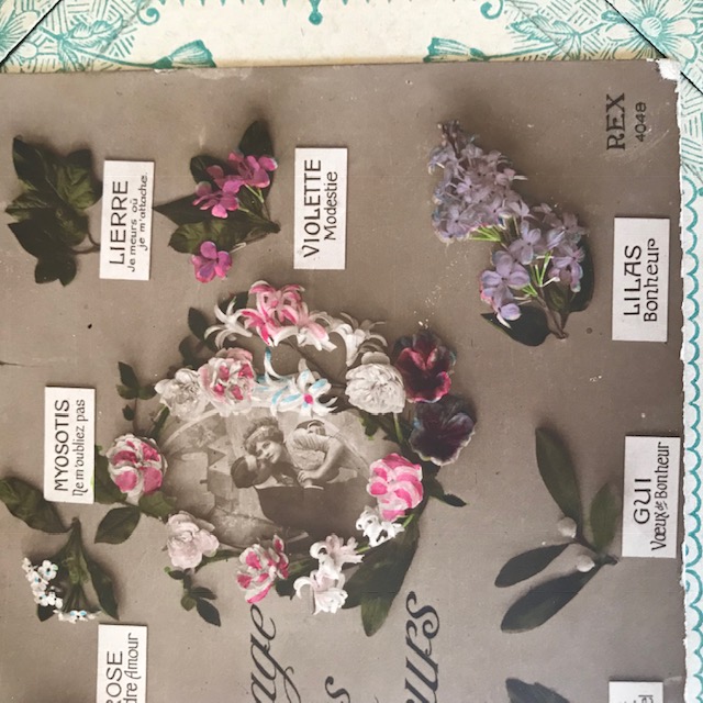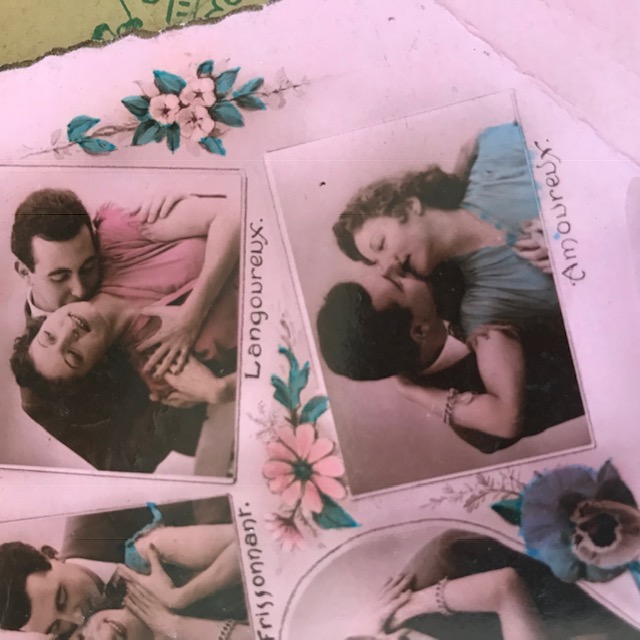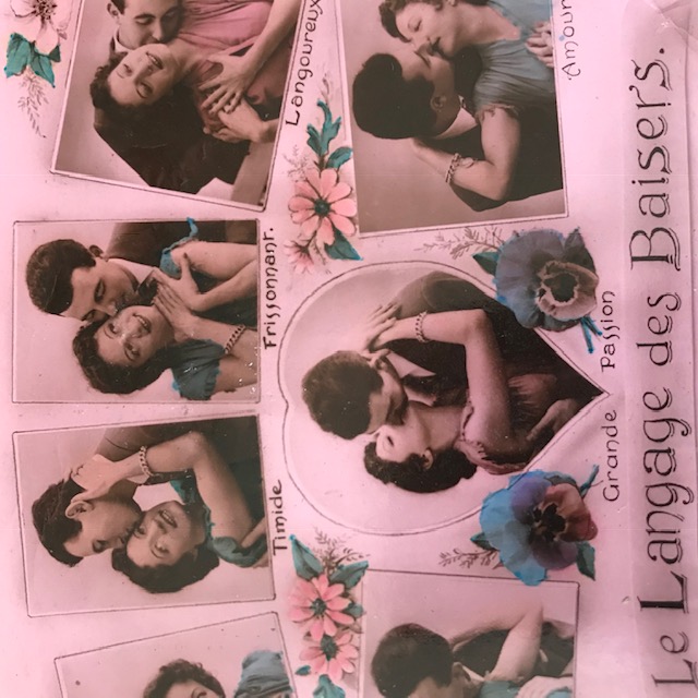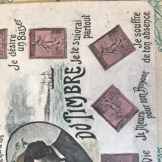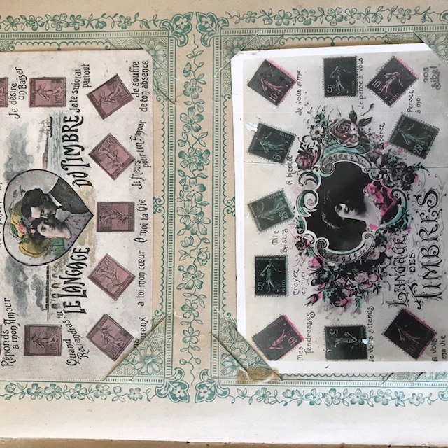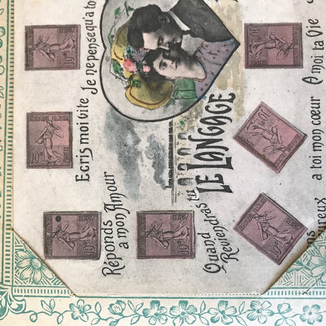 Recently, I found several French postcards in souvenir booklet from the 1900s. What caught my eye was that the cards were in series, extra charming, depicting the language of love in unusual ways such as the language of love in stamps. Depending on how one would stamp an envelope for example if the stamp was upside down it meant, "Believe in me" if the stamp was sideways it meant I like you.