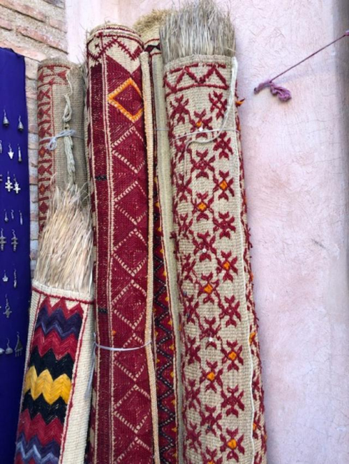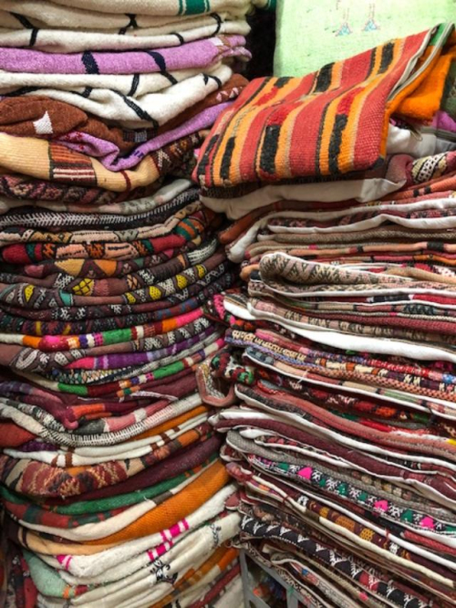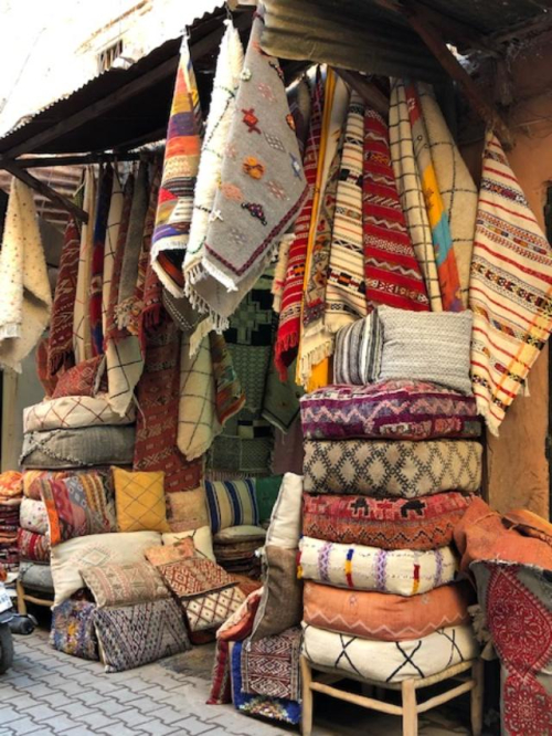 I spent a few hours sitting in a young man’s workshop in the souk in Marrakesh while he talked about where he finds his carpets and watched him make cushions and poufs. Most of the pieces were old (not antiques but definitely handmade) it was sad on one hand to watch them being cut, but on the other hand, creating new purpose. The souk is filled with artisans practicing old trades works such as leather, textiles, basket weaving, woodwork… I enjoyed every minute being in the Medina in Marrakesh talking with the people there.