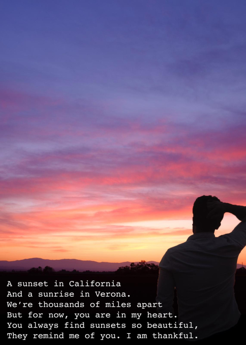 No matter where we are in the world the sun will rise and set for us. The same sun shining on you is shining on your loved ones. 🙂