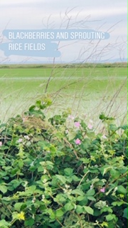 Every day I go for a walk around the rice fields behind my mother's home. I can walk along the dirt roads that the farmers use to check their crops for miles and miles endlessly around rice fields that are taking root. The pleasure of seeing nature take its course and farmers working steadily with the season. The blackberry vines are growing wildly as they should, and I have spotted and noted the ones I can reach to gather for my mother's blackberry pies.