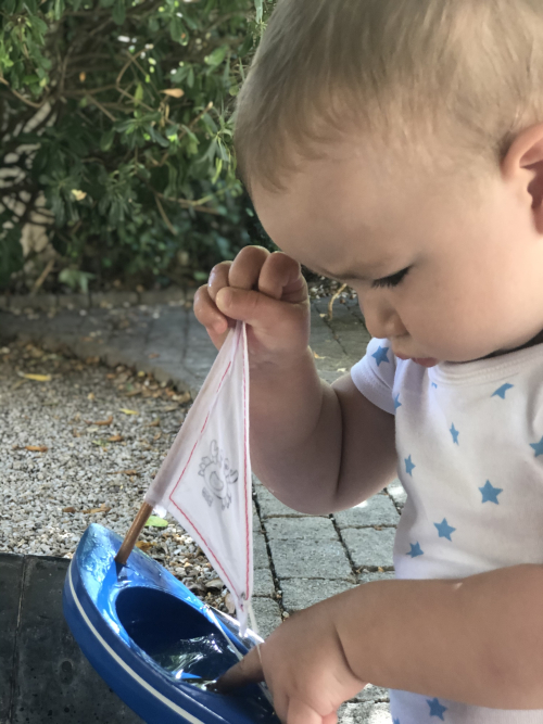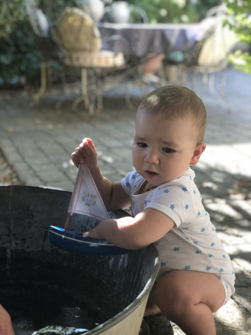 A large zinc basin served as a pond for Gabriel to sail his sailboat with sound effects he vocalized of a motorized boat vroom vroom.