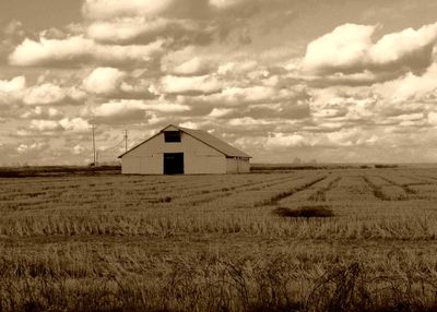 A barn in the middle of a harvested rice field.