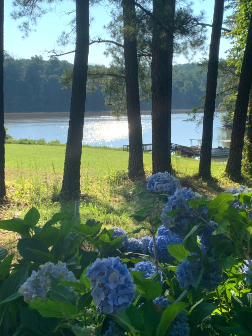 The view from the lake house- the blue hydrangeas sold me.
