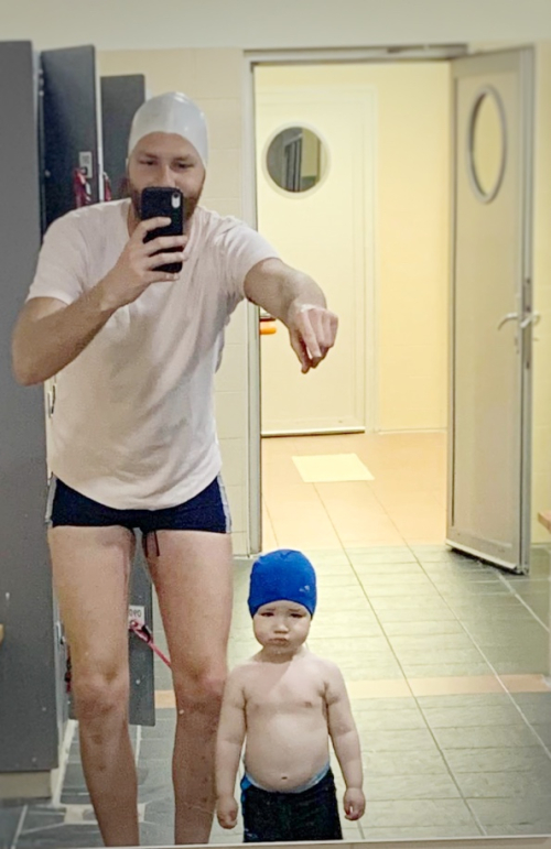 No one likes to wear a swim cap, but Gabriel is tolerating it because he knows what a pleasure* it is to swim! *And a privilege: the public pools and pools in clubs and gyms in our city have been closed for the last year due to the pandemic. 💚🏊