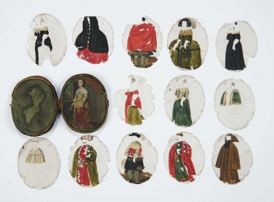 The first miniaturists used watercolor to paint on stretched vellum, or (especially in England) on playing cards trimmed to the shape required. During the second half of the 17th century, vitreous enamel painted on copper became increasingly popular, especially in France. In the 18th century, miniatures were painted with watercolor on ivory, which had now become relatively cheap. As small in size as 40 mm × 30 mm, portrait miniatures were often fitted into lockets, inside watch-covers, or pieces of jewelry so that they could be carried on the person. Others were framed with stands or hung on a wall or fitted into snuff box covers." Wiki listed below.