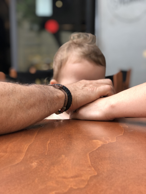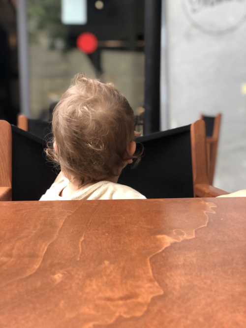 He wanted to sit in a big chair, so here we were waiting for our drinks to come.