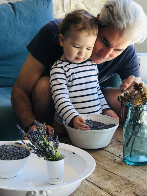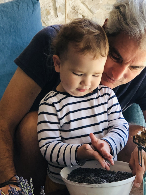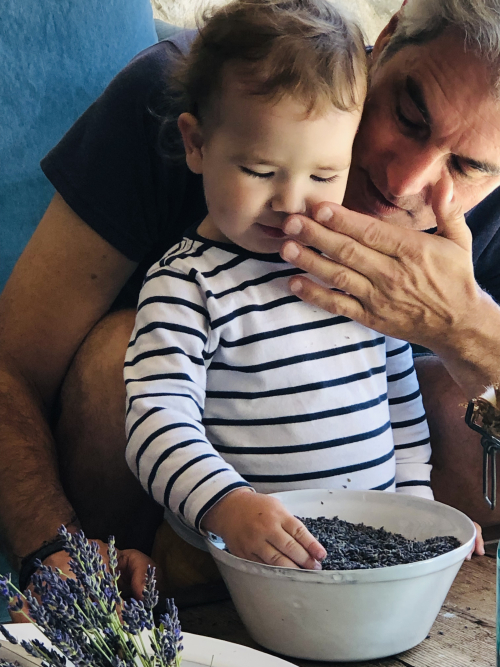 Love the photo of Gabriel leaning in to smell the sweet lavender! What adorable photos with his grandpere!