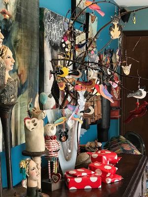 The tree this year is an upcycled nude Red Pin Oak branch with handmade ornaments of leather, glass, metal, clay and textiles. The dogs and cats started it and then I added the birds. We call it ‘the fun wall.’ Happy Holidays ?