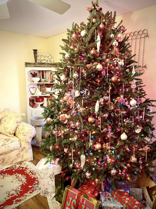 Wishing you and yours a Very Merry Christmas dear Friend! So fun seeing everyone’s trees! My tree is a nod to my heritage born and adopted. Lots of German glass icicles, French crystals and my Italian nativity. I would choose white lights but my husband loves the multi colored and I love him.