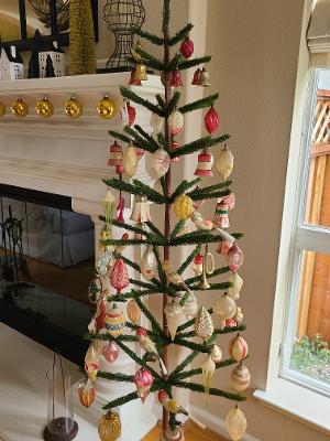 I have several Christmas trees. A large feather tree filled with 200 early Radko ornaments. A smaller imitation feather tree with a collection of very early ornaments, most of which were found under a table, in an old crate at the Alameda Antique Fair, several years ago. The 3rd is an even smaller imitation feather tree with a collection of Radko fruit ornaments.