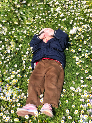 I asked if he would like to lay down in the patch of daisies? Instantly, and quite surprisingly, he got off his pushbike and walked over