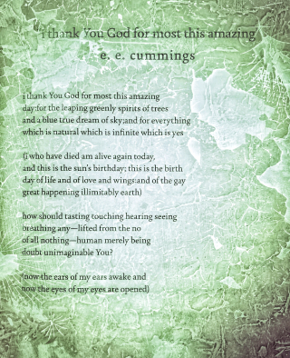 I was not familiar with this e.e. cummings poem. “A blue, true dream of sky…” It is so wonderful! Thank you.