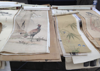 Fabulous rice paper calligraphy art. Stacks and stacks of it. I do not know much about this type of artwork except that seemed beautiful. As I stood there admiring it and selecting what pieces I might like with my mind’s eye. An Asian dealer came by and asked the stall owner how much for one of the pieces? I listened intently, curious as to what it sold for. Without a moment hesitation the dealer said, »I will take place all of it. » It must have been the real deal and as good as my mind’s eye thought.