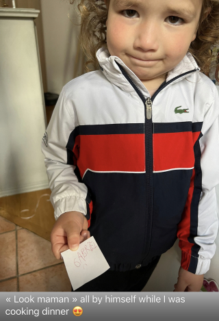 Those sweet, mischievous sidewise smiles tell you something is happening, but you don’t know what until the big reveal with that the miracle of discovery comes forth. In this case, Gabriel walked into the kitchen and showed his mother a note he had written by himself. Oh, this little bundle of creative energy, that magical, mystical boy Gabriel.