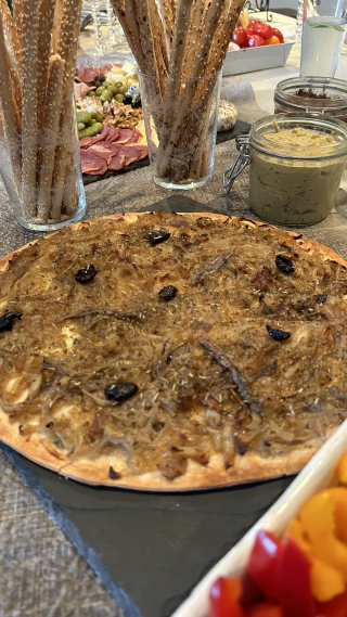 Pissaladiere; It is often compared to pizza. The dough is usually thicker than that of the classic pizza Margherita, and the traditional topping consists of caramelized onions, black olives, and anchovies (whole, and sometimes also with pissalat, a type of anchovy paste.)