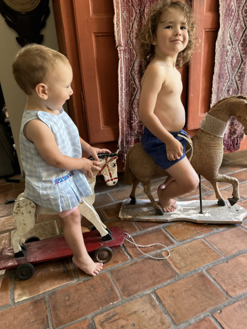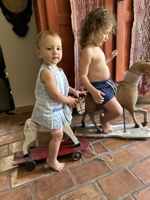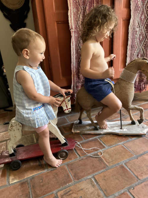 Gabriel and Olivia are not galloping on them. They sit and giggle.