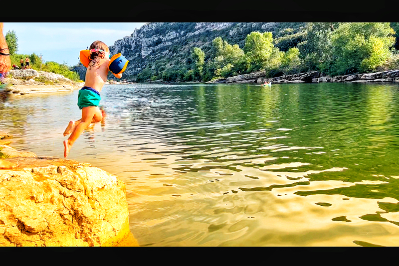 Gabriel, known for his overly cautious nature and doubtfulness, surprised us by jumping in and swimming across to the other side with his Dad and Yann. It was a wondrous sight! His bravery encouraged me to overcome my reservations and join him in the river.