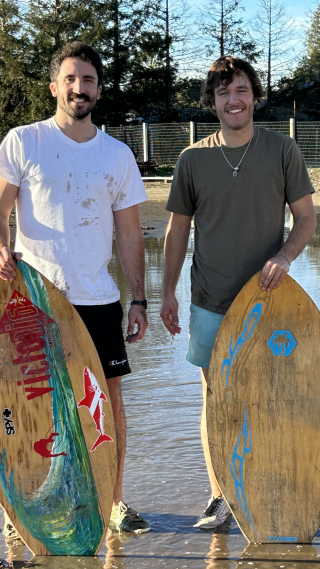 After the rainy day, skimboarding on massive puddles in the fields behind the house.