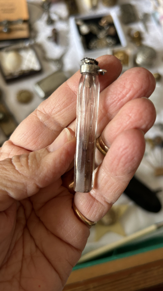 Tussy Mussy, used to hold fresh flowers. The glass bottle is a tear catcher, Victorian.