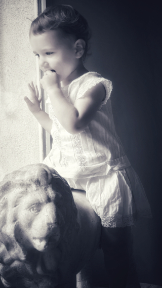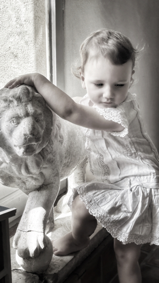 Such a beautiful portrait of Olivia in her precious dress… the sturdy lion, the placement of the child’s sweet foot next to the lion’s paw… the lighting through the window, the use of sepia tones that highlight the textures of stone and lace, Olivia’s baby smooth skin and soft, wispy hair. Another stunning photographic composition — capturing a fleeting moment in time — for your family to treasure.