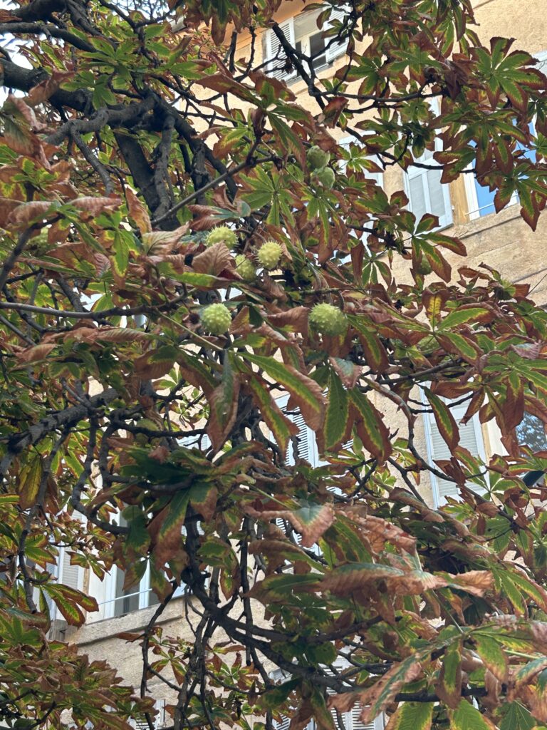 Chestnuts, in their prickly casing,