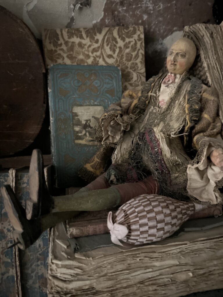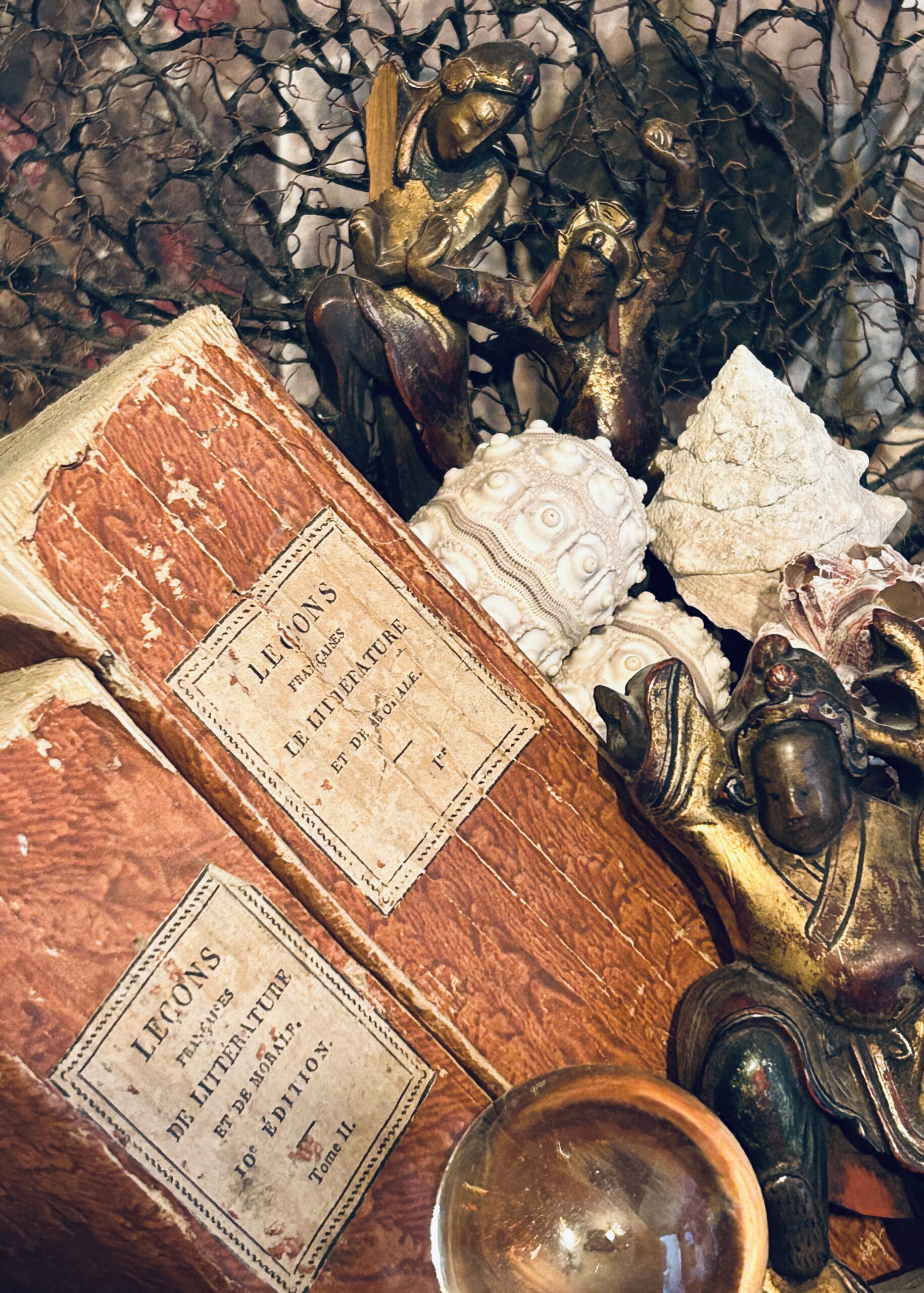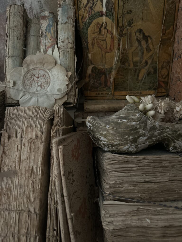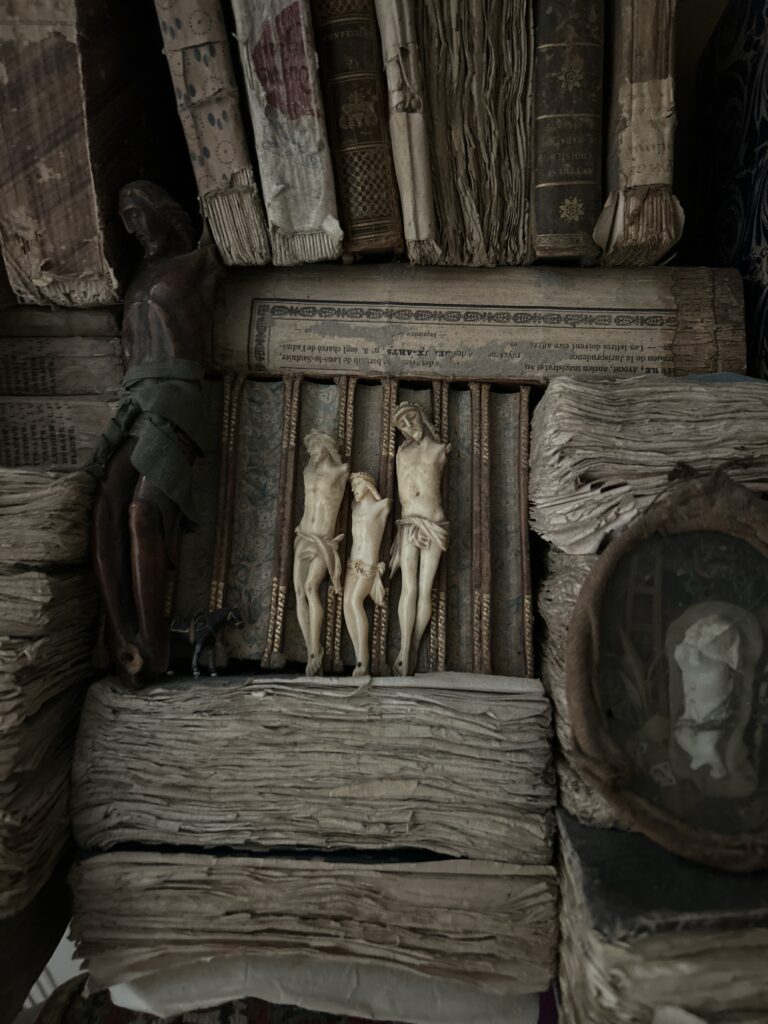The strange part is the tiny things tucked between the books, behind the books, on top of the books — they do not draw attention. A stack of Tarot cards, played so often they are entirely covered in scotch tape. A fragment of a wax flower wedding wreath. A bald Santon, staring out silently. A violin without strings.