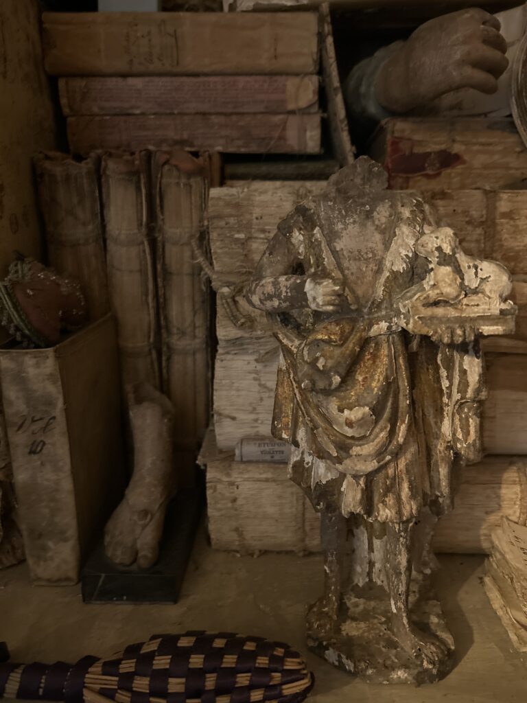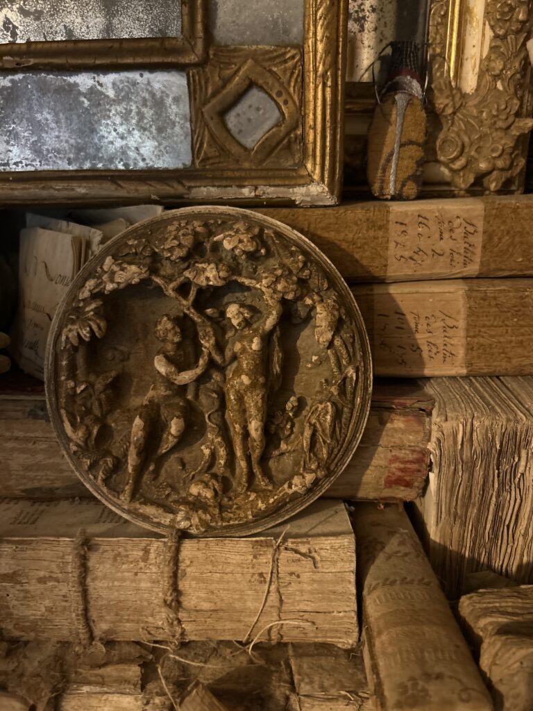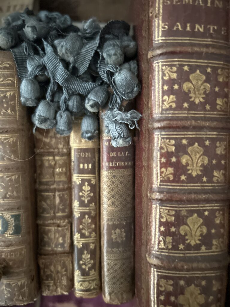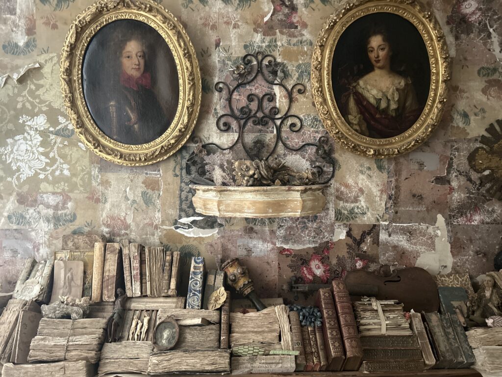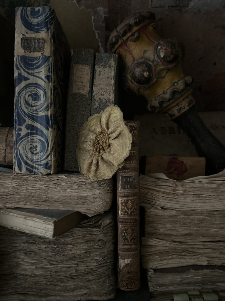The strange part is the tiny things tucked between the books, behind the books, on top of the books — they do not draw attention. A stack of Tarot cards, played so often they are entirely covered in scotch tape. A fragment of a wax flower wedding wreath. A bald Santon, staring out silently. A violin without strings.