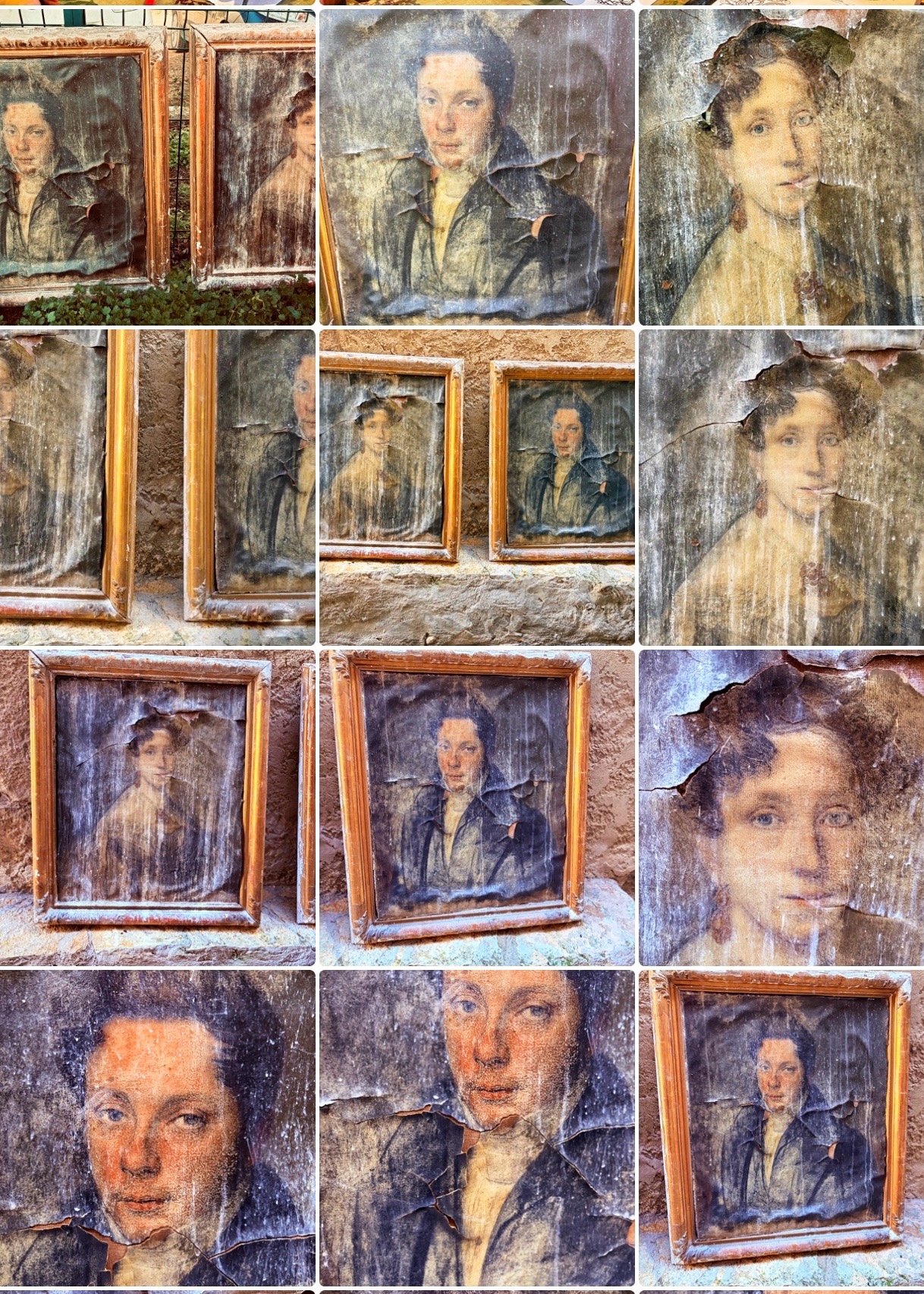 These two are clearly a couple. Bound together by history, gravity, and matching frames that were once gilded and beautiful. Time has not been kind. Nor has moisture. They are barely hanging on.