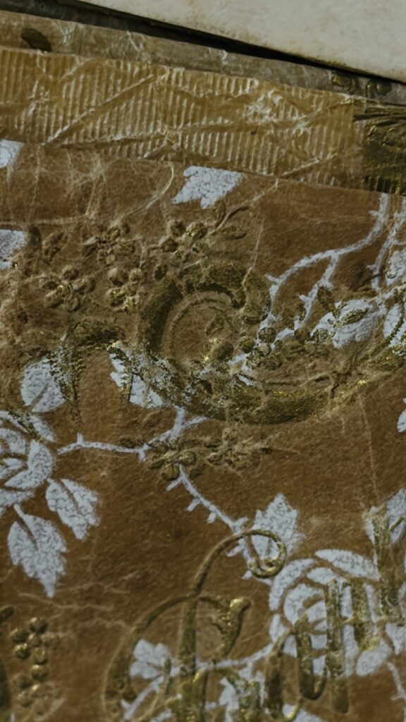 Inside, the bags, gold foil, religious imagery, chalices and hosts still catching the light, hand painted floral details-